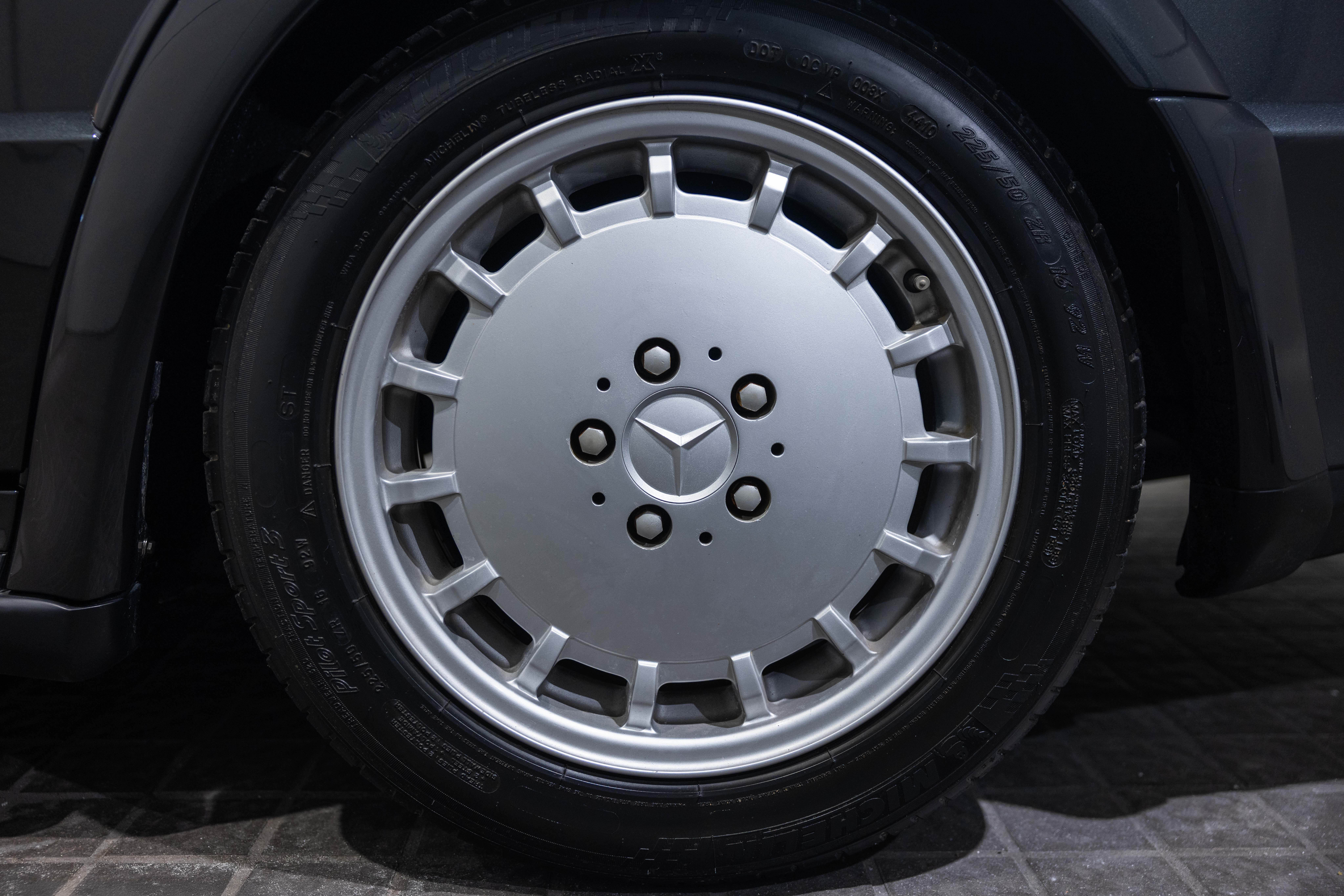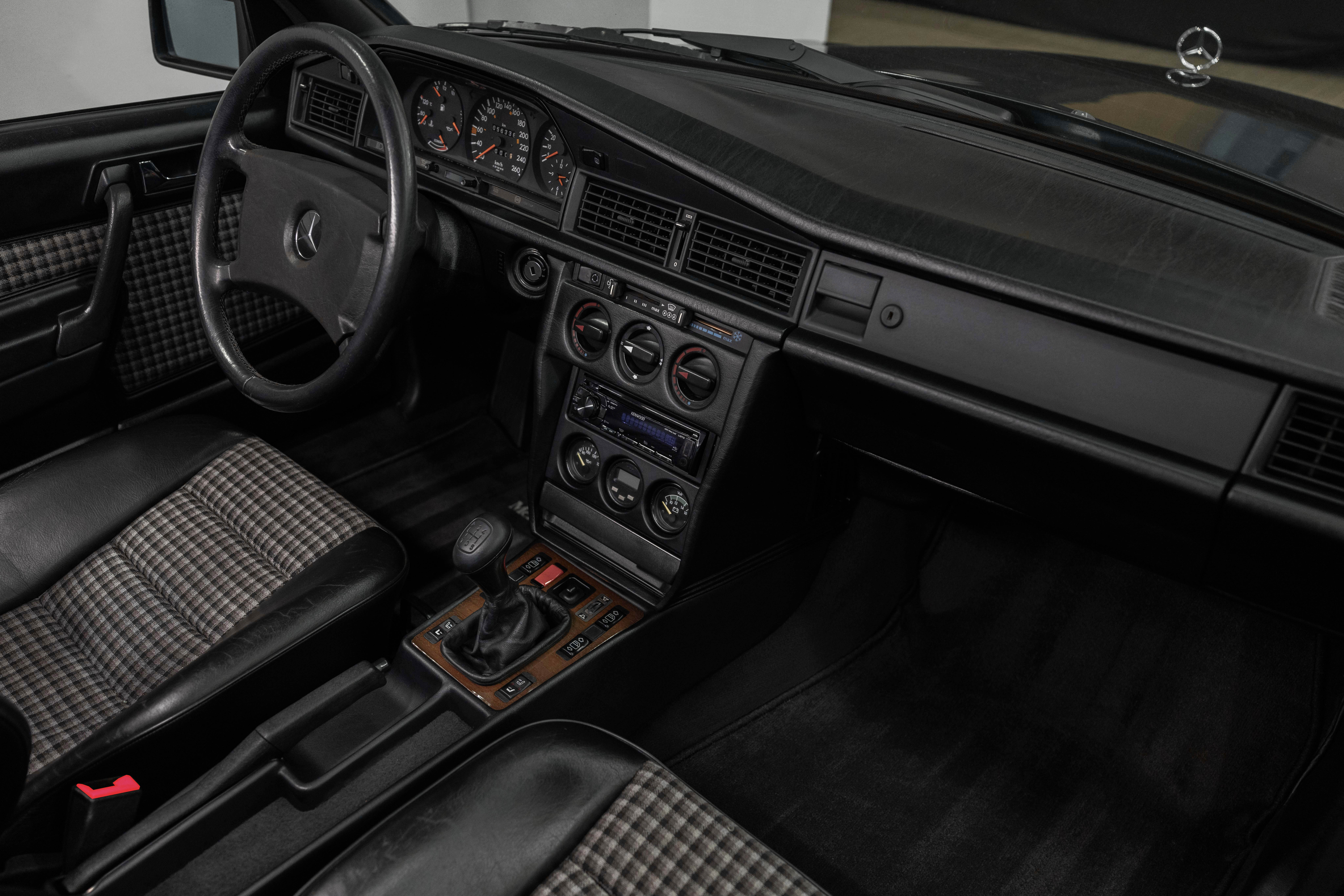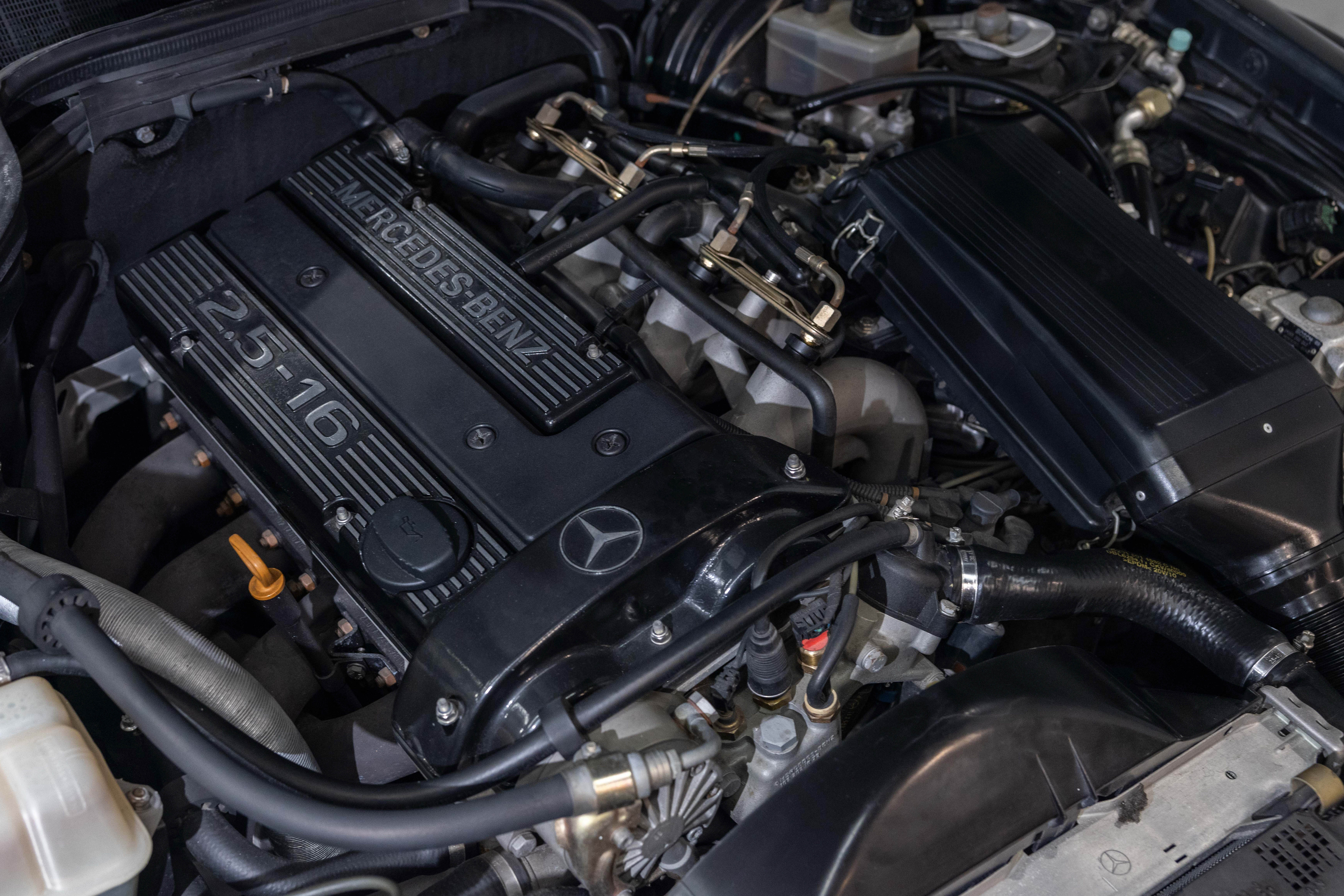As a hand-built model, the Evo I exemplified Mercedes-Benz quality and exclusivity. It features an upgraded aerodynamic package, enhanced engine, larger brakes, and bigger wheels to homologate these features for the 1989 DTM cars. Its special bodykit included side skirts, a splitter, and a large rear wing, reflecting the peak of 1980s and 1990s tuning. The Evo I is paired with a dogleg Getrag 5-speed manual gearbox as standard, and its 2.5-litre engine produced 205 horsepower, matching the standard 2.5 16V model. There is also a special in-cabin switch-enabled electronic ride-height adjustment for both track and road use, with the default setting 19mm lower than the non-Evo model.