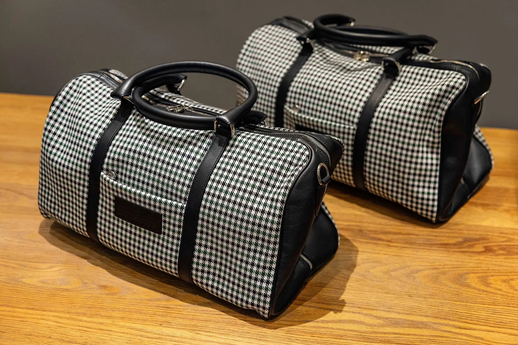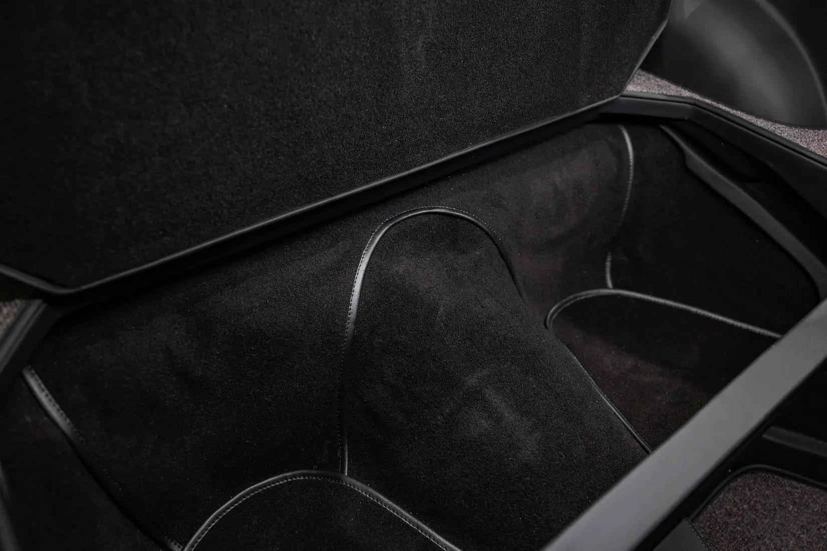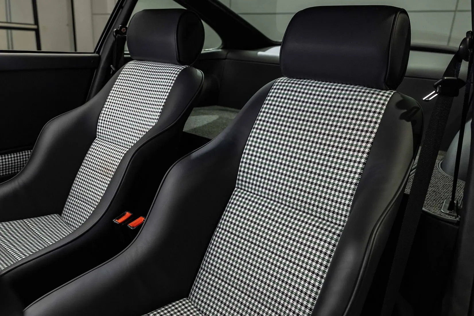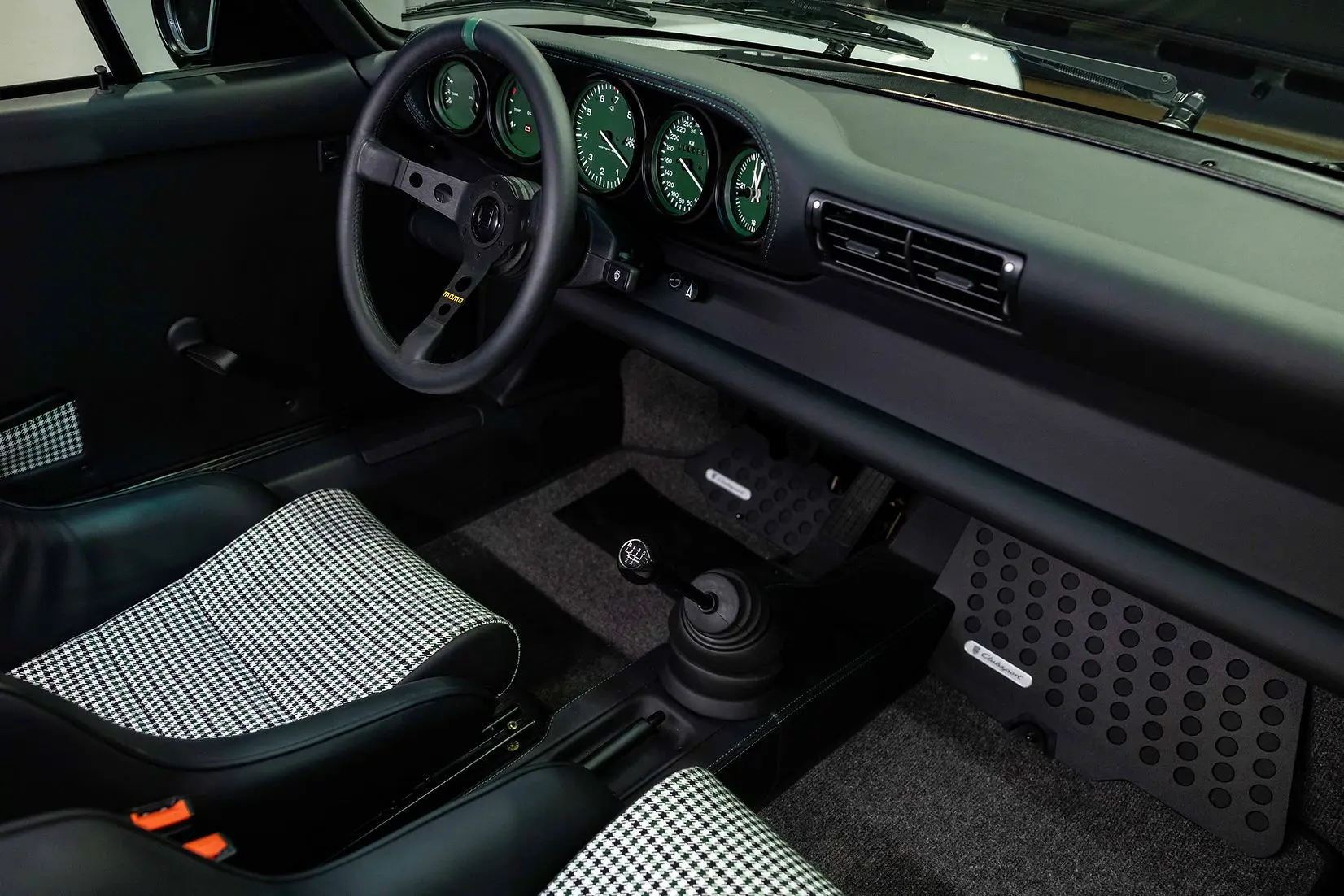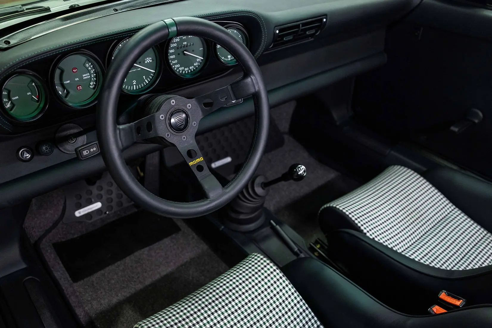 This particular example is specified in the M472 Touring specification, which offers a bespoke interior with ST-style touring seats in black leather and Le Mans Classic houndstooth inserts. The cabin is further refined with hand-stitched leather panels, houndstooth door pockets, green boucle floor mats, and aluminum footrests. Additional features include green door pulls, seat belts, custom dials, and a 24-hour clock. Each car is equipped with a luggage box in place of the rear seats, a specially commissioned Le Mans Classic luggage set, and hand-painted bodywork details.